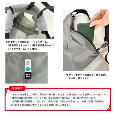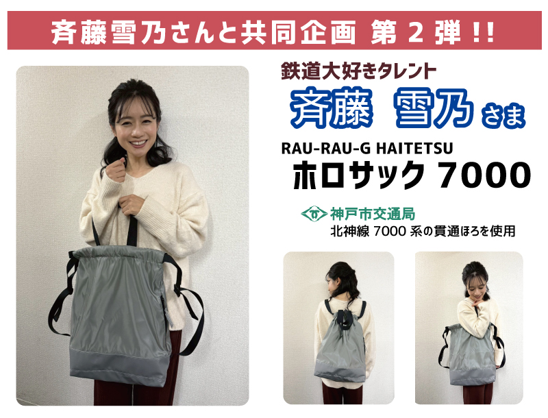 神戸市交通局”北神線7000系”の貫通ほろを使用したナップサックが登場!ナップサックの底の部分がホロなのでなんといっても水や摩擦にも強く安心感があります。ネームタグはサイドポケットのチャックの持ち手につき、揺れるキーホルダーのよう。バッグは背負ったり肩にかけたり手に持ったりと3WAY仕様となっております。
