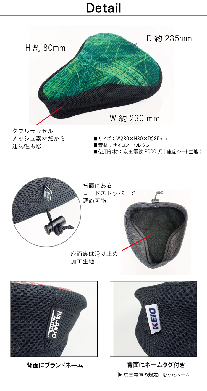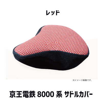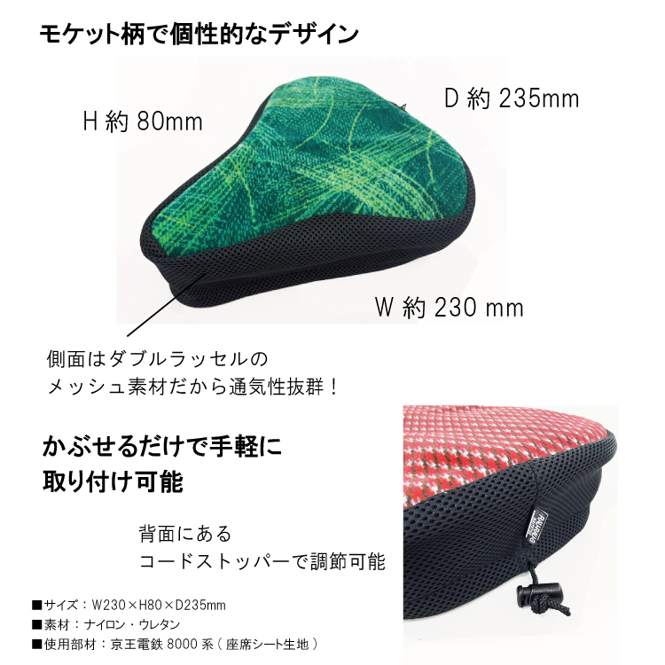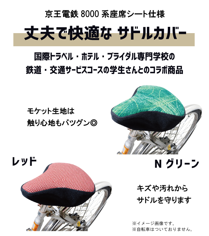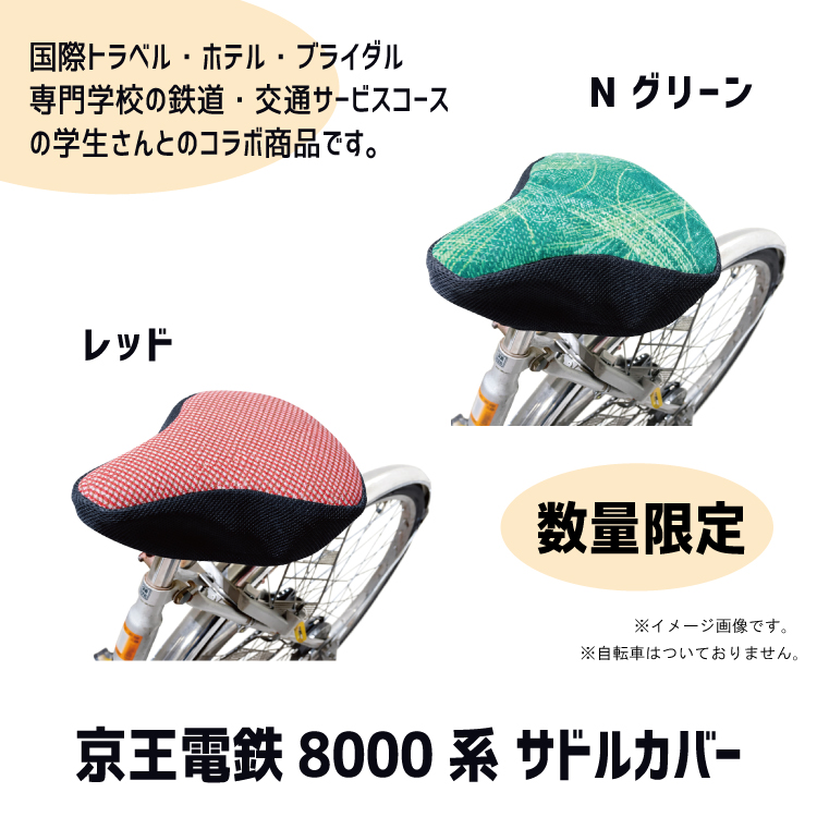 国際トラベル・ホテル・ブライダル専門学校の鉄道・交通サービスコースの学生さんとのコラボした商品ができました!京王電鉄8000系の座席シート生地(モケット)を使用した自転車のサドルカバーが登場!