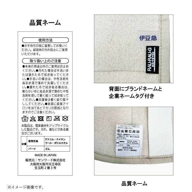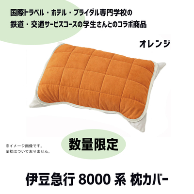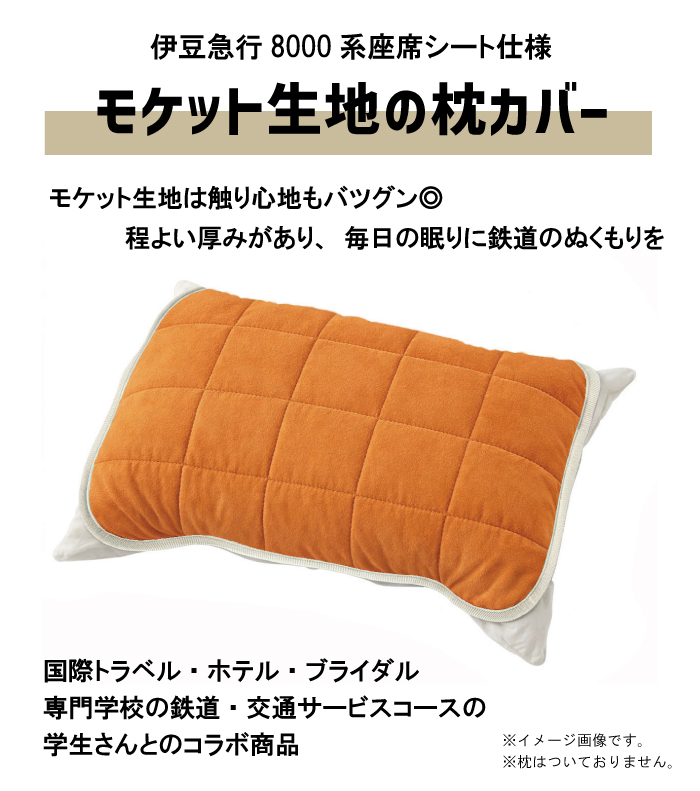 国際トラベル・ホテル・ブライダル専門学校の鉄道・交通サービスコースの学生さんとのコラボ商品ができました。伊豆急行8000系の座席シート生地(モケット)を使用した枕カバーが登場!