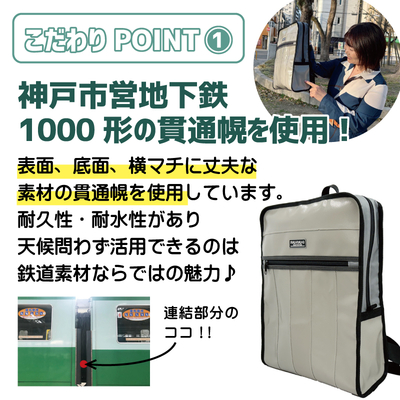 神戸市交通局”西神・山手線1000形”の貫通ほろを使用したリック”ホロパック”が登場!ホロパックの表面・底面・横マチの部分がホロなのでなんといっても水や摩擦にも強く安心感があります。大容量パックでパソコンもしっかり入ります。横マチは下部から上に向かって少しマチを小さくすることでスタイリッシュに仕上げました。シンプルな配色でどんな場面にも使いやすいので通勤や通学にもおすすめ◎
